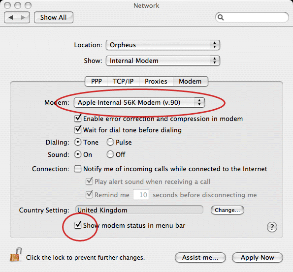 Important note regarding modem type: Some newer Macs may set the default modem type as 'Apple Internal 56K Modem (v.92)'. This is wrong because the v.92 standard is not universally adopted yet, so you should change the modem type to 'Apple Internal 56K Modem (v.90)' if you have difficulty connecting to Orpheus using the default setting.